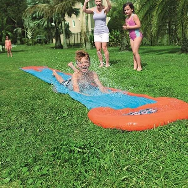 This slip and slide water slide is the perfect addition to any garden on a sunny day and will give kids hours of active fun. Slip, slide and glide across the 16ft (4.88m) runway that is kept wet and super slippery by the built-in sprinkler system.