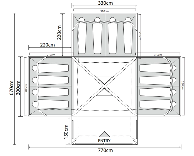 The breathable 4 berth inner tents included can be clipped in to provide a luxurious sleeping area, designed to accommodate up to twelve average-sized adults; This is created using our darkened ‘Twilight’ fabric, in order to cut down on exterior light and help you attain a deep, cosy and uninterrupted night’s sleep. This model utilises our bedroom ventilation system to maintain a comfortable sleeping environment by optimising airflow, whilst helping combat condensation and internal humidity.