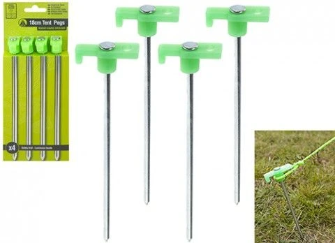 18cm tent pegs with glow-in-the-dark top to be seen in the dark, tops of pegs are also flat to help minimise injury on campsites.
